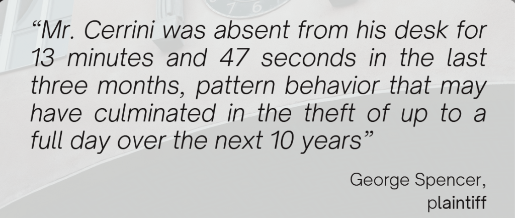 The prosecution successfully presented their case, arguing that although Mr. Cerrini appeared to have only been unexplainedly absent from his desk for 13 minutes and 47 seconds in the three months since he started working for Ros&Lind, this was pattern behavior that may have led to incremental absences over time, culminating in the theft of up to a full day over the next 10 years.